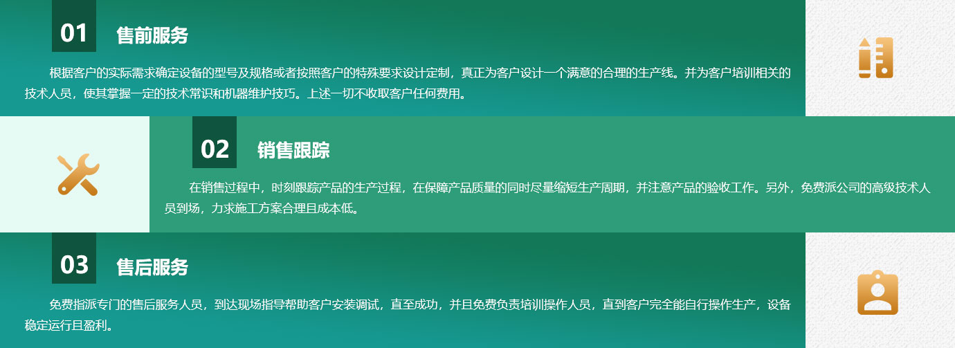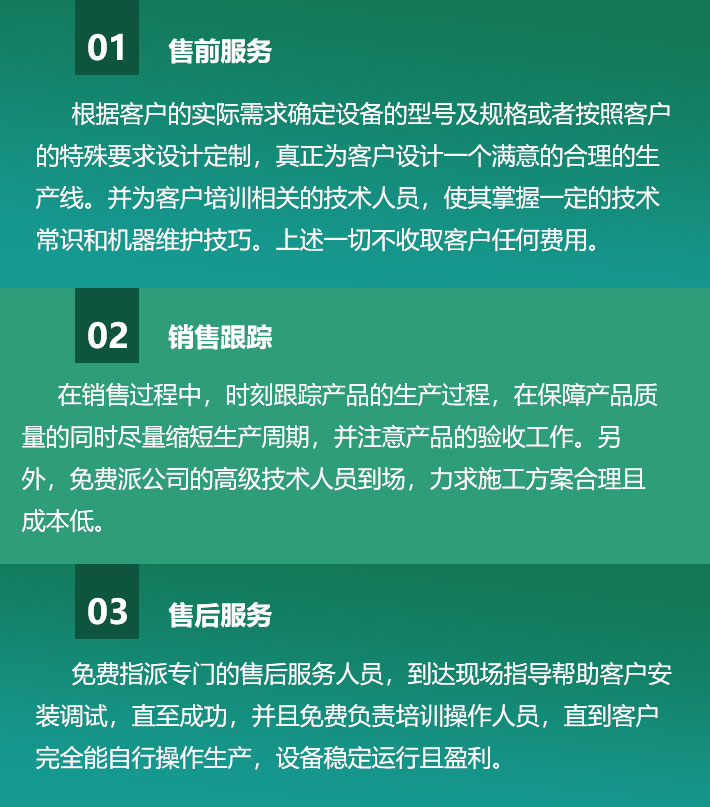 鼎力公司堅持以“熱愛我們的客戶,為客戶創(chuàng)造財富帶去歡樂”作為服務理念,保證鼎力品牌的質(zhì)量和良好信譽,鄭州鼎力將以優(yōu)質(zhì)的服務態(tài)度,始終如一的服務熱情,為廣大的客戶提供滿意的售前售后服務,為此公司制定了一系列為客戶提供從計劃、設計、實地勘察、設備調(diào)試安裝、維護回訪等具體的內(nèi)容,真正做到的高質(zhì)量、高服務。